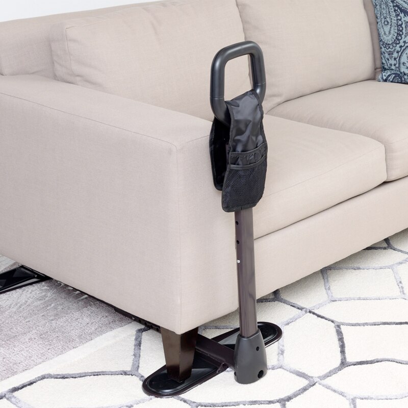 POIGNÉE DE SÉCURITÉ : Le Couch Cane dispose d’une poignée debout qui peut être utilisé avec les deux mains et fournit l’équilibre et le soutien jusqu’à 250 livres en position assise ou debout. SAC DE SELLE : Le sac de selle à quatre poches est suspendu à la poignée Couch Cane et offre un rangement pratique pour les petits objets comme les télécommandes TV et les téléphones portables. PATINS EN CAOUTCHOUC : Les patins de base en caoutchouc de taille double peuvent aller de chaque côté de la chaise et s’ajustent à la distance entre les jambes avant et arrière de votre chaise. ENTIÈREMENT RÉGLABLE : Ajustez la hauteur de la poignée de 34po - 40po pour s’adapter à vos préférences et fournir un effet de levier optimal pour se tenir debout. Les patins de base s’ajustent en profondeur de 20po à 36po COMPATIBLE AVEC LA PLUPART DES CHAISES : Installez le CouchCane sous les pieds de la plupart des chaises éclairées à quatre pieds, des fauteuils inclinables, des canapés ou des canapés avec des pieds allant de 20po à 36po en profondeur.