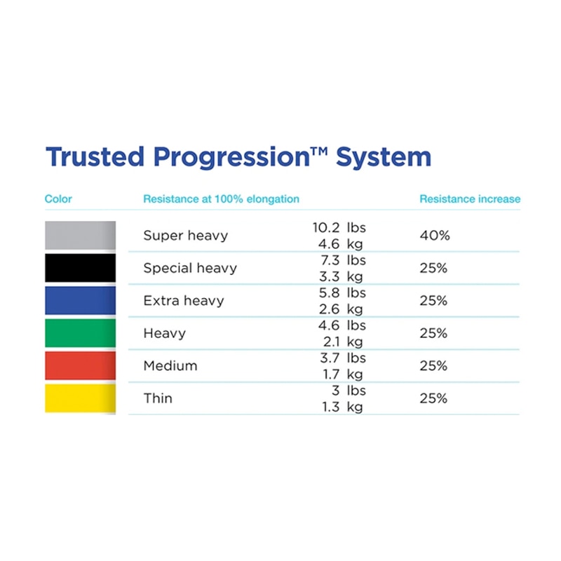 Le tube professionnel non latex THERABAND® offre des performances identiques à nos tubes en latex sans risque d’allergies au latex. La formule TPE de THERABAND est sans poudre ni parfum et également plus durable par rapport aux alternatives en latex THERABAND. Fièrement fabriqué aux États-Unis, la formulation unique intègre notre système de progression fiable avec des plages de force de traction constantes et six niveaux de résistance codés par couleur THERABAND allant du jaune (1,3 kg) au argenté (4,6 kg).