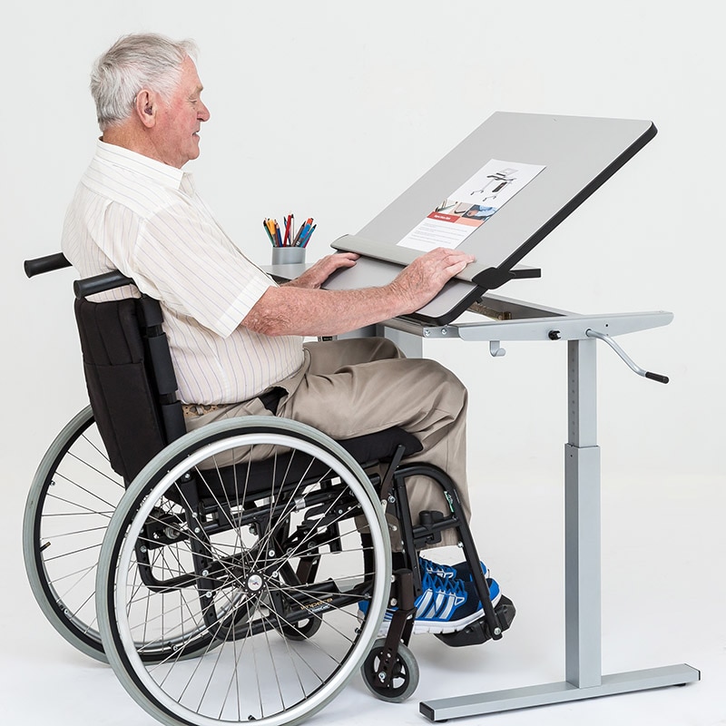Particulièrement bien adaptée aux utilisateurs de fauteuils roulants avec repose-jambe. Hauteur réglable dans une échelle de 34 cm. On peut lire la hauteur sur les pattes télescopiques graduées. Le réglage se fait au moyen d’une manivelle. .Dimensions totales plateaux: 60 x 90 cm (23.5 x 35.5") .Dimensions du plateau Inclinable: 60 x 60 cm (23.5 x 23.5') .Dimensions du plateau fixe: 12 x 23.5" (30 x 60 cm) .Hauteur réglable: 56 à 90 cm (22-35.5") NOTE: Le porte crayons et la règle de lecture sont des accessoires et ne sont pas inclus.