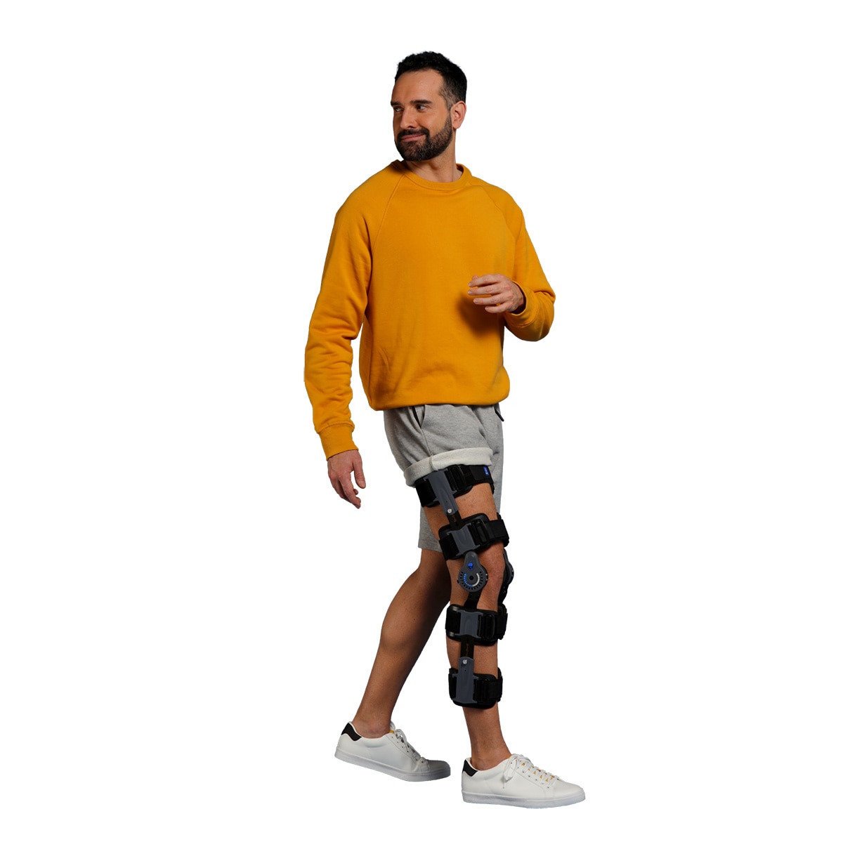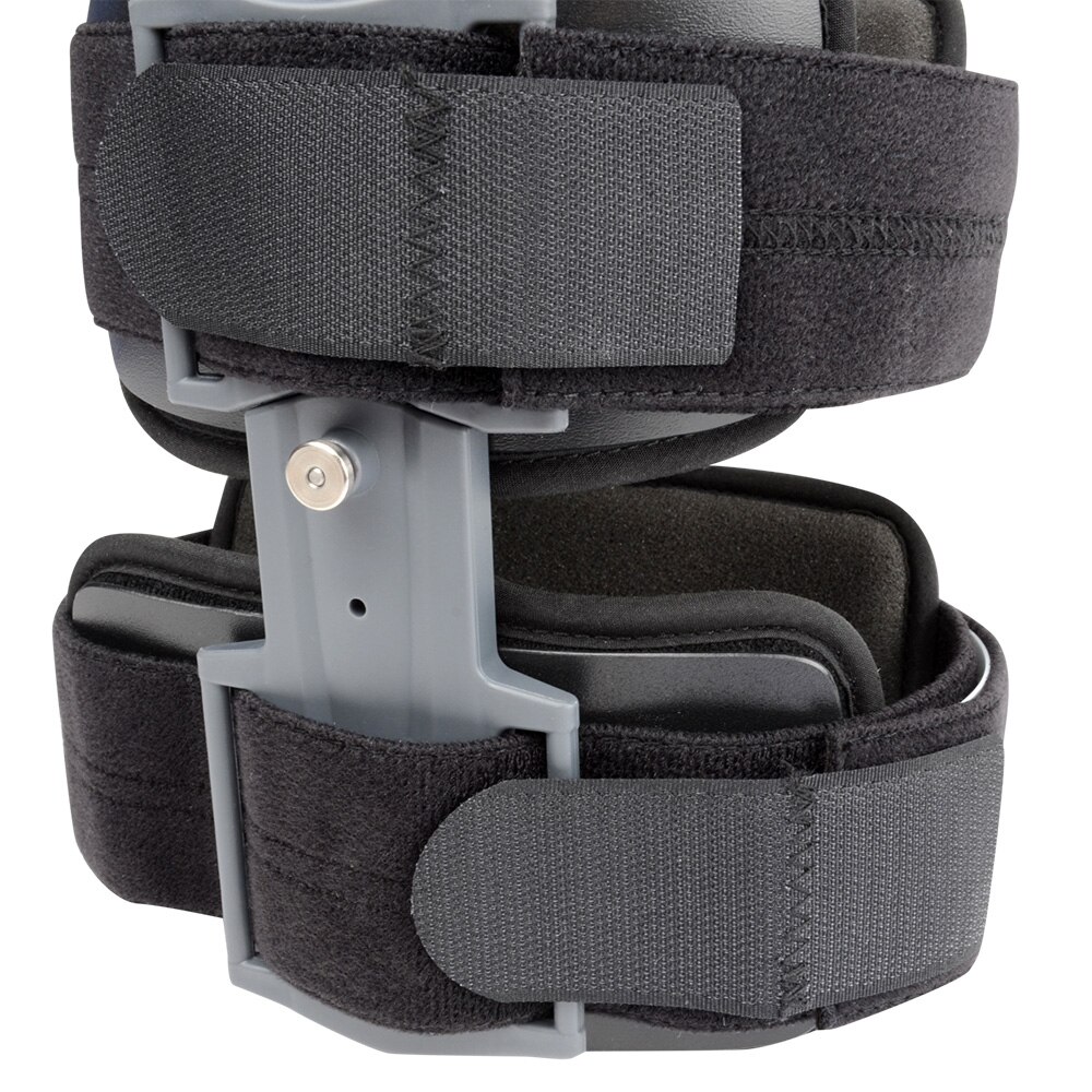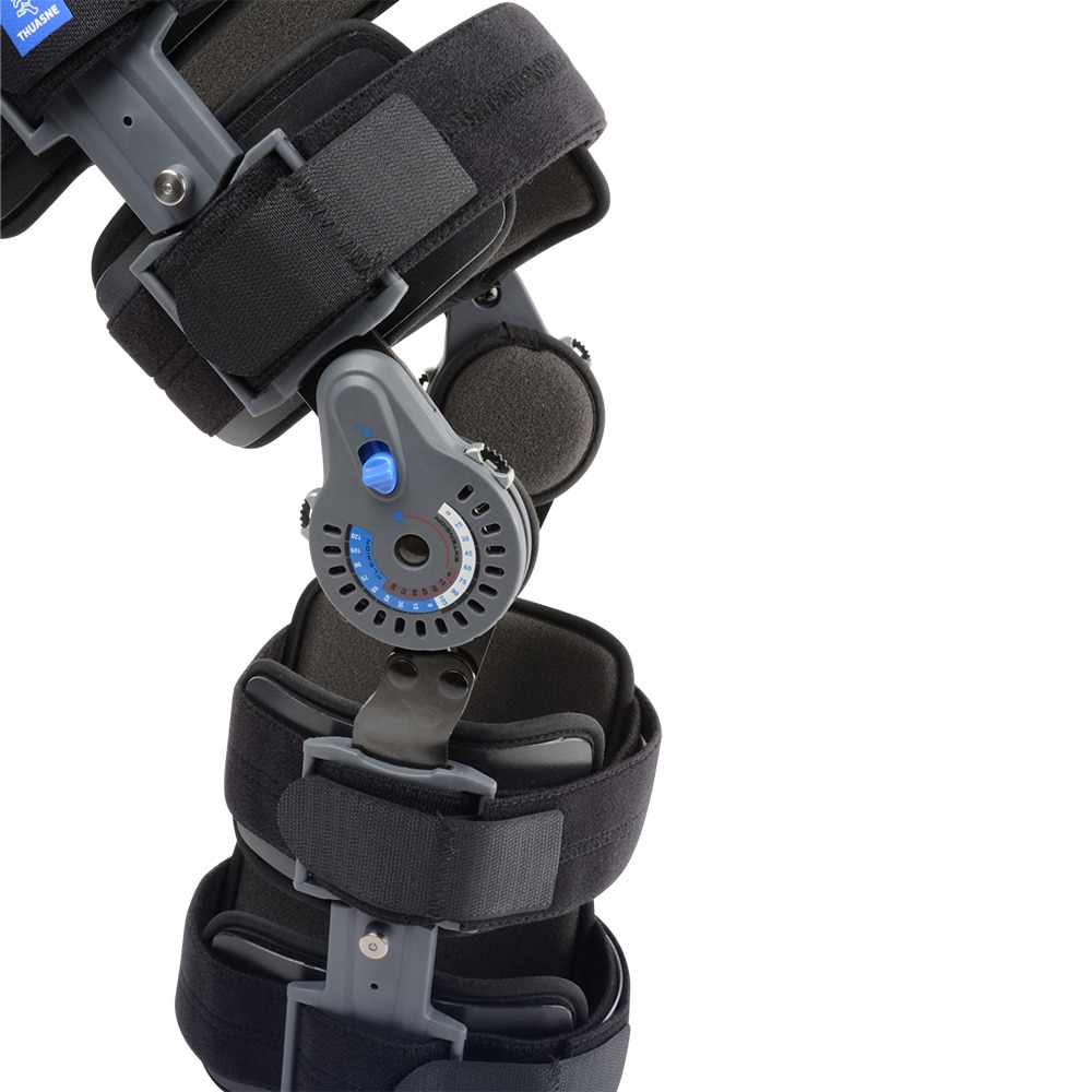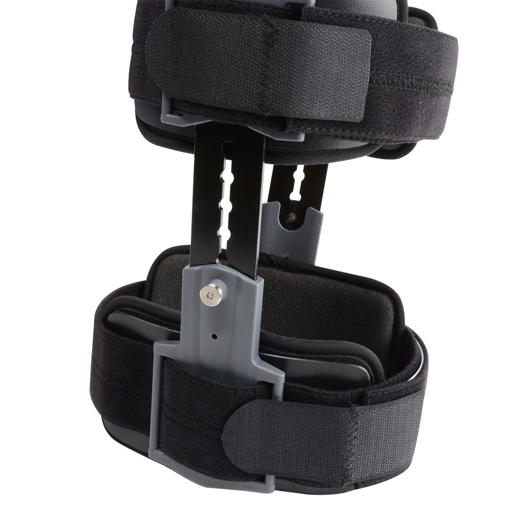 . Immobilisation assurée par 2 baleines latérales . Système de verrouillage pour immobiliser la jambe de 0-90 degrés par sauts de 15 degrés . Réglage de la flexion (0-120 degrés) et de l'extension (0-105 degrés) sans outil par sauts de 15 degrés INDICATIONS