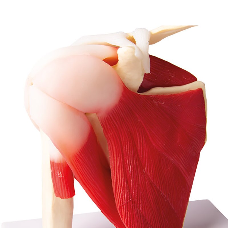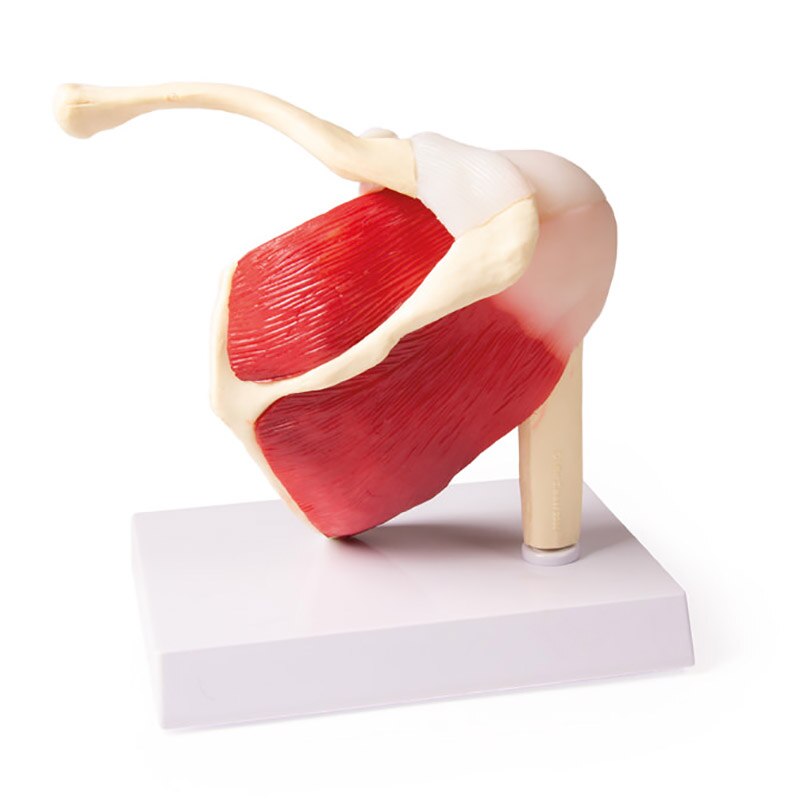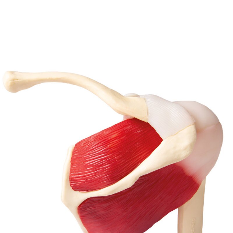 Articulation scapulaire humaine de grandeur nature avec représentation de la manchette de rotateur (M. supraspinatus, M. infraspinatus, M. teres minor, M. teres major et M. subscapularis) ainsi que les tendons du M. biceps brachii. La mobilité de l‘articulation est restreinte. Livraison avec carte didactique (anglais). Sur support. .Taille : 17 x 15 x 12 cm .Poids : 540 g