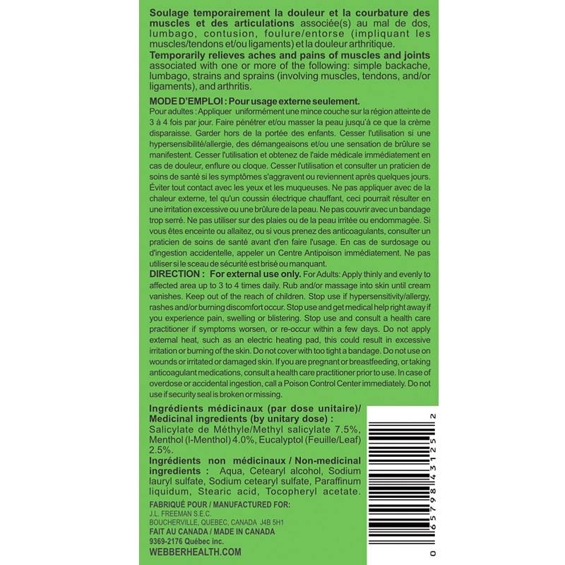 WEBBER Activ+ Crème analgésique Originale à la vitamine E. Soulage temporairement la douleur et la courbature des muscles et des articulations associée(s) au mal de dos, lumbago, foulure/entorse (impliquant les muscles/tendons et/ou ligaments) et la douleur arthritique. Procure une sensation de chaleur tout en hydratant la peau (100ml). Description : La crème analgésique WEBBER Activ+ Originale avec vitamine E est conçue pour offrir un soulagement temporaire ciblé des douleurs musculaires et articulaires. Le salicylate de méthyle agit comme un agent anti-inflammatoire et analgésique, tandis que le menthol procure une sensation de qui peut aider à calmer la douleur. L’eucalyptol, extrait de la feuille d’eucalyptus, offre des propriétés antiseptiques et stimulantes qui peuvent favoriser la circulation sanguine dans la zone affectée, améliorant ainsi le processus de guérison. Ces composants travaillent en synergie pour détendre les muscles, réduire l’inflammation et apaiser la douleur. À propos de cet article Crème analgésique puissante. Procure une sensation de chaleur. Vitamine E hydratante. Contient du Salicylate de Méthyle, Menthol et Eucalyptol. Pénètre rapidement dans la peau. NPN 80068932. Caractéristiques et avantages: WEBBER Activ+ est une crème analgésique puissante qui dégage de la chaleur et un parfum de menthol et d’eucalyptol. Soulage d’une façon efficace et rapide les douleurs arthritiques, musculaires et rhumatismales. WEBBER Activ+ contient de la vitamine E pour conserver une peau bien hydratée. Crème analgésique pour le soulagement de la douleur. Mode d’emploi : Appliquer sur la zone désirée, activez en massant 30sec. la zone appliquée et relaxez. Pour usage externe seulement. Garder hors de la portée des enfants. Arrêter l’utilisation en cas d’irritation, d’éruption cutanée ou une sensation de brûlement. Ne pas utiliser à proximité des yeux ou d’une plaie.